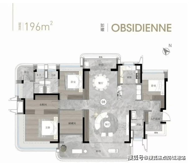 约215㎡东南向四房:横跨客厅与次卧的巨幕景观阳台,堪比标准主卧面积,打造空中花园;南向双套房设计,主卧配备步入式衣帽间、多功能区及L型飘窗,仪式感与实用性兼备。