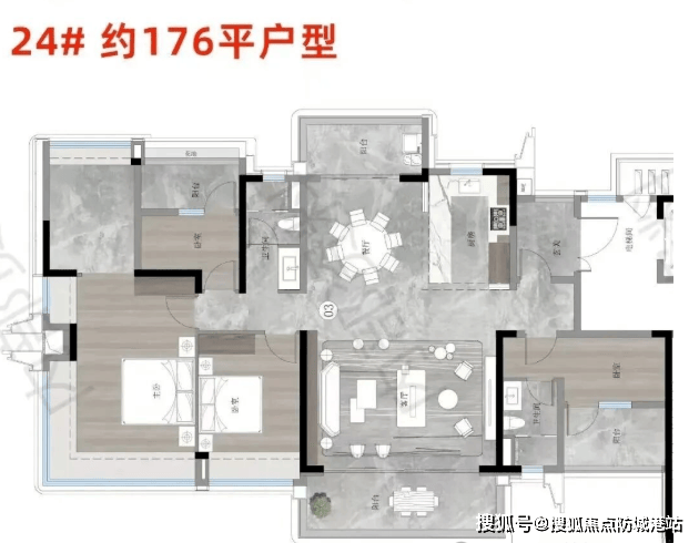 约176㎡西南向四房:独立电梯厅保障隐私,转角玄关设计避免视线直穿;公区集中布局,形成高效洄游动线;南北双阳台兼顾晾晒与观景;最多可打造三套独立卫浴空间,满足多代同堂或二胎家庭需求。