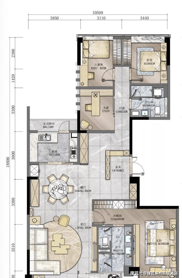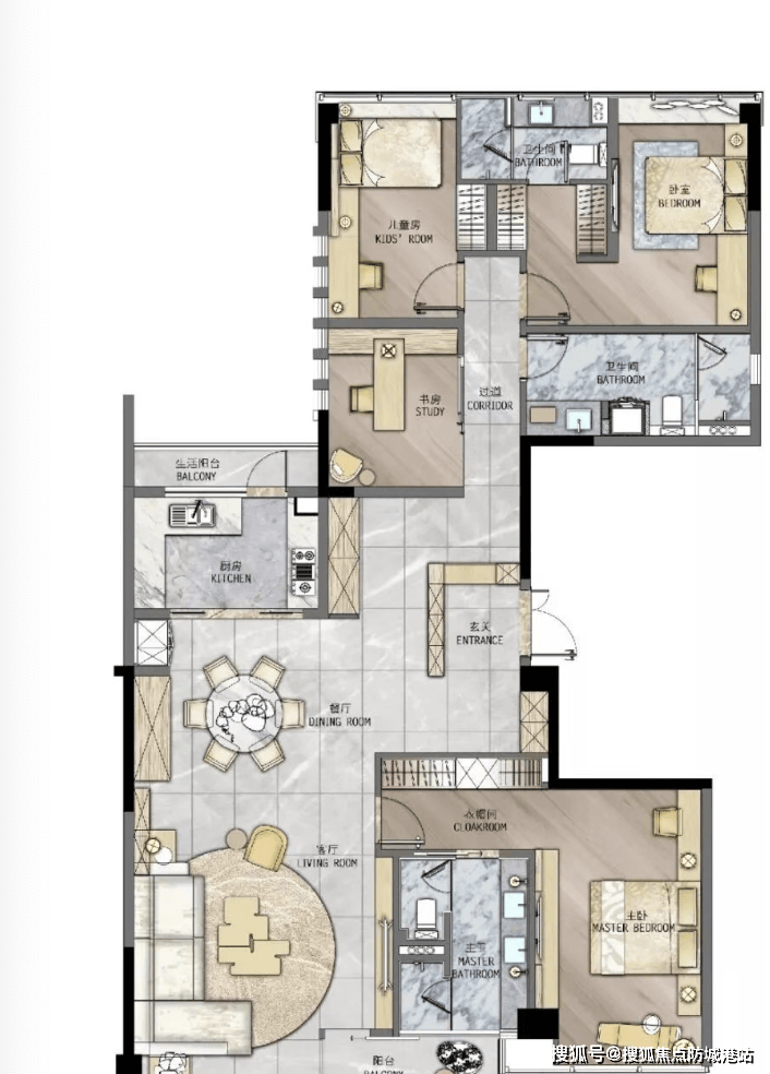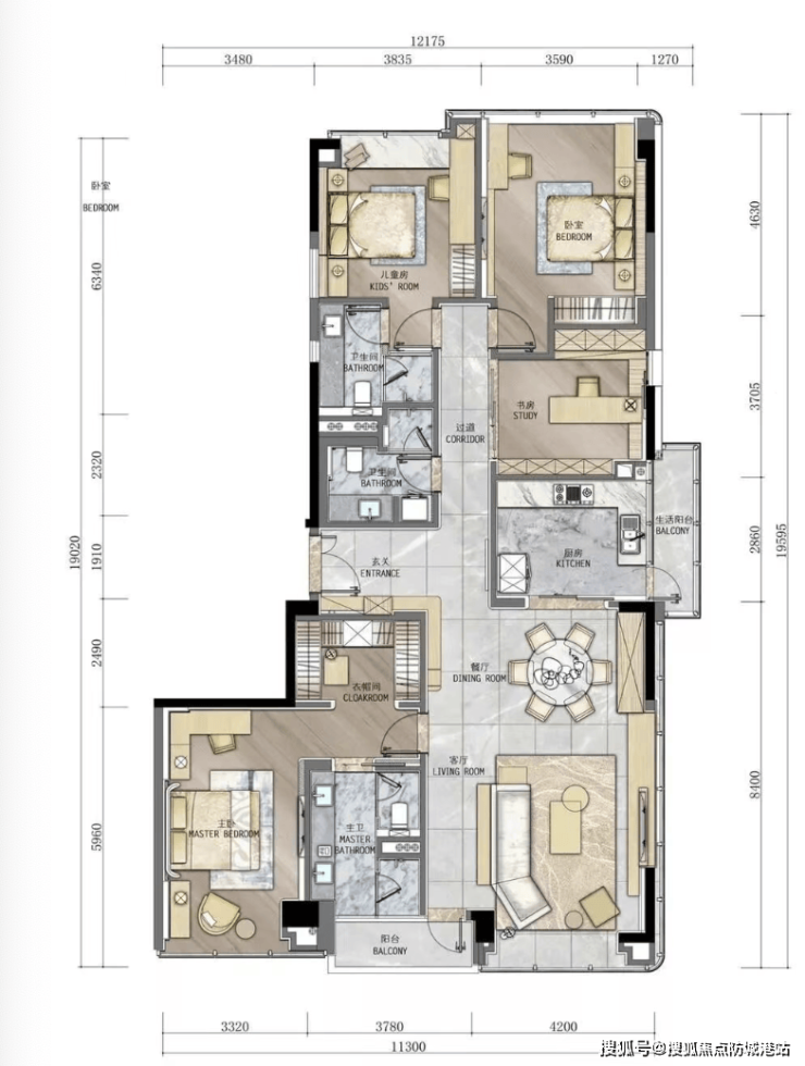项目主力户型为166㎡和207㎡四房,设计亮点: