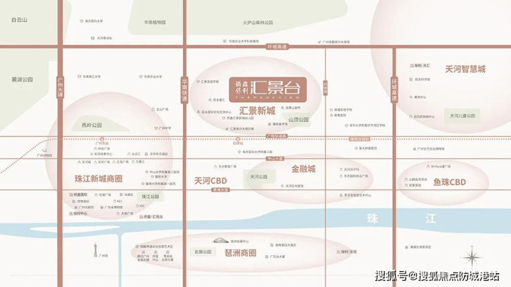 项目位居天河核心地段,南近珠江新城,尽享都市繁华;北望火炉山,自然景观尽收眼底;东望科韵路,西接汇景新城社区两公里景观中轴带,与科学城、智慧城、广东奥林匹克体育中心相邻,地理位置得天独厚。交通方面,广园快速、华南快速、深海高速环绕,虽距离地铁3号线五山站有一定距离,但大部分住户自驾出行方便,且未来19号线将通至汇景新城,交通便利性将进一步提升。