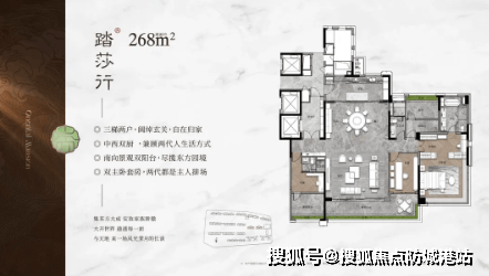 268㎡顶豪户型:3梯2户设计,配备保姆电梯,约63㎡ LDKG客厅,双主套设计,满足大家庭私密需求。