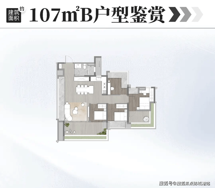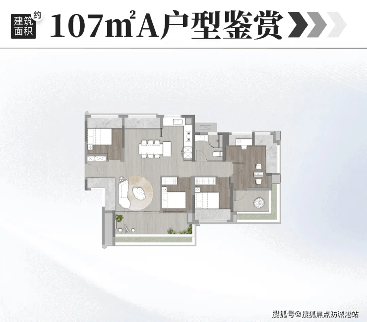 107㎡四房:6.8 米宽景阳台,江景视野极佳,实际使用面积相当于传统 120㎡以上户型,空间利用率超高,是项目最畅销户型;