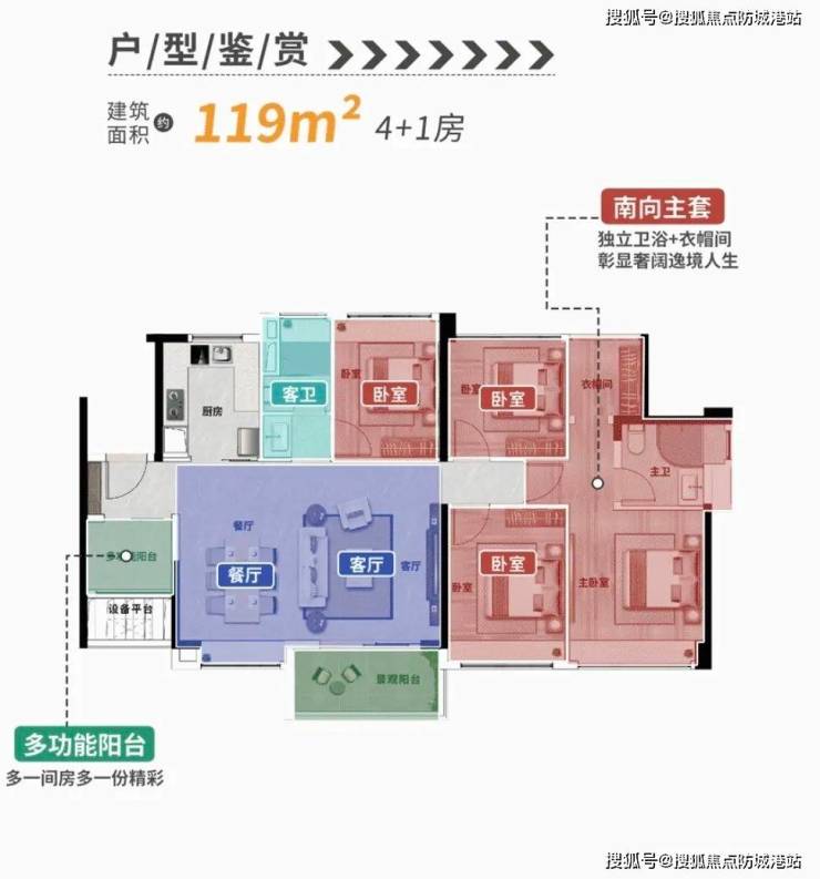 大面积的119平能做到4+1房,四舍五入就是个五房单位了,缺点是阳台有点小,少了点豪宅感。