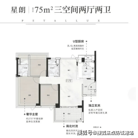 作为刚需入门级户型,75㎡能做到三房两厅两卫,在广州市场上极为罕见。户型方正通透,独立玄关可改造为储藏室,大大提升收纳空间;U型厨房操作台面充足,烹饪更加得心应手;主卧带独立卫浴和270°环幕视野,即使是小户型也能享受舒适居住体验,特别适合首次置业的年轻家庭。