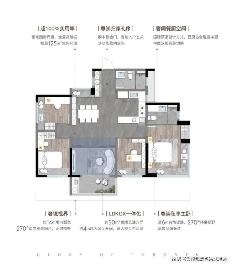 4房2厅2卫:LDKG超大尺寸方厅,超宽景观阳台,自在生活的无界场域。