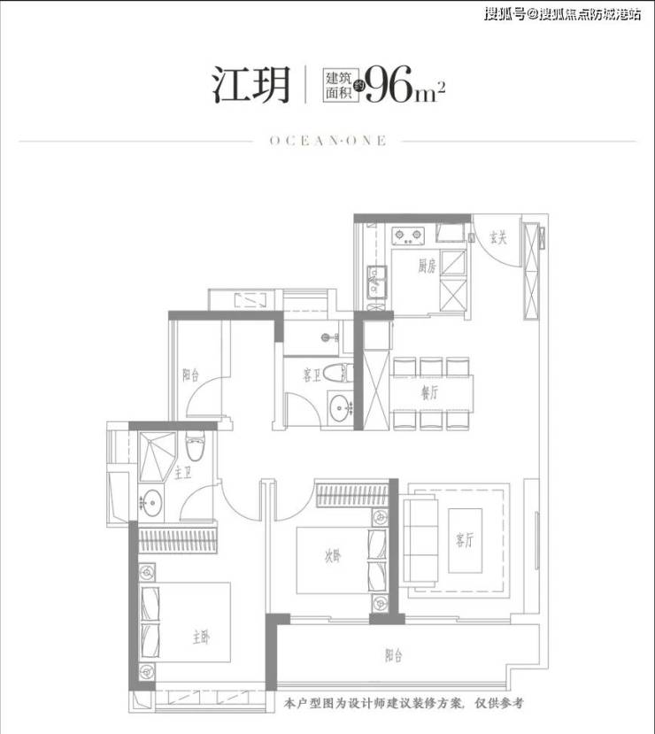 越秀江海潮鸣项目的约96平方米2+1房型有两种户型设计:一个采用了竖厅设计,另一个采用了横厅设计。此外,这两种户型都采用了主人房和次卧分开的飞机户型设计。