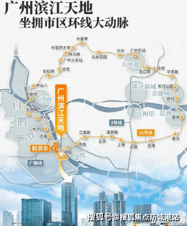 项目的交通优势十分突出,距离已开通的地铁 11 号线鹤洞东站直线距离不足 200 米。作为广州首条地铁环线,11 号线可快速串联珠江新城、金融城、琶洲等核心 CBD,也能直达大湾区艺术中心、永庆坊等文化地标;未来还可 3 站接驳在建的 22 号线,其南延段通车后将直通深圳。同时,规划中的佛山地铁 11 号线也将在项目南侧设站,广佛同城出行更便捷。项目还打造了拉德芳斯式的站城一体化 TOD 模式,规划水上巴士线路,形成 “地铁 + 城际 + 水上交通” 的立体出行网络。