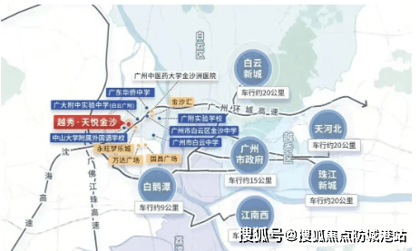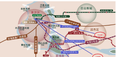 越秀天悦金沙位于广佛交界的金沙洲,横跨广州白云区和佛山南海区,临近荔湾区,与广州主城区相隔不远。项目距离白云山、白鹅潭等核心区域较近,为居民提供了便捷的通勤条件。