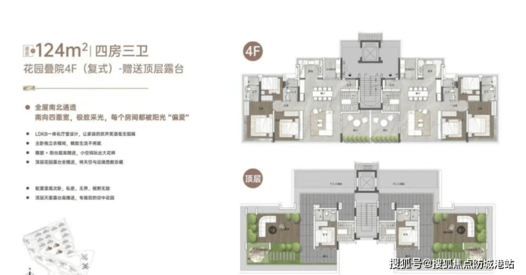 125㎡四房:横厅设计,面宽达6.8米,双阳台贯通,主卧套房配独立卫浴,得房率约85%;