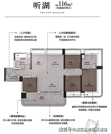 116㎡ 四房两厅两卫:东南向户型,奢阔景观阳台超7米大开间,南北通透大开间。