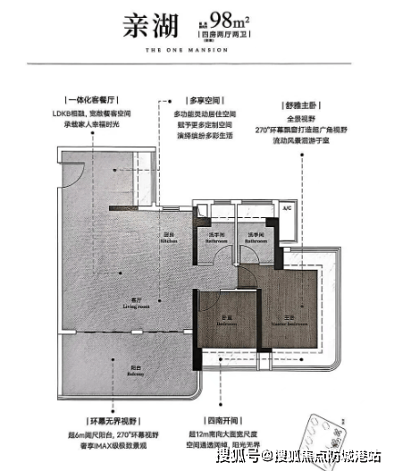 98㎡ 四房两厅两卫:东南向户型,超6米阔尺阳台,270°环幕视野,四开间朝南。