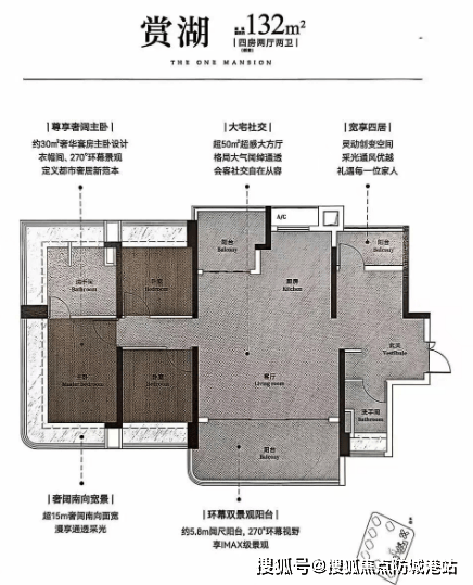 132㎡ 四房两厅两卫:西南向户型,百米楼距园景,进阶四房首选,超感大方厅。