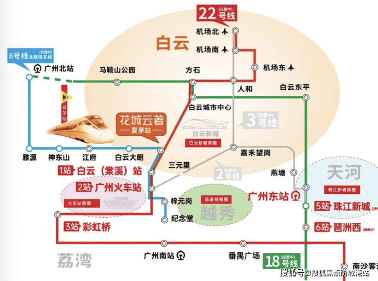 从现有交通来看,项目距离地铁22/8号线北延段支线夏茅站仅约50米,完全就是在家门口。根据高德地图数据显示,乘坐22号北延线,1站可到达白云站,2站到达越秀,3站到达老荔湾,换乘18号线后,5站即可直达珠江新城(冼村)。22号北延线作为广州南北大动脉,时速达160公里,贯穿空港、白云棠溪、广州火车站、南站等7大枢纽,全线换乘高达16处之多,无缝接轨广州全市。乘坐8号线北延段支线,可迅达越秀、花都,串联广州北站和白云棠溪TOD。