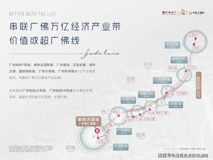 广州地铁7号线是第二条真正意义上连接广佛的地铁线路,串联北滘新城、广州南站、汉溪长隆、万博CBD、国际创新城、广州大学城、鱼珠CBD、广州科学城等8个产业商务极点,构建起广佛万亿黄金产业走廊。