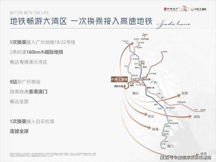 1次换乘接入广州18/22号线(全国最快的2条时速160km/h的城际高速地铁),未来可畅达粤港澳大湾区核心城市;