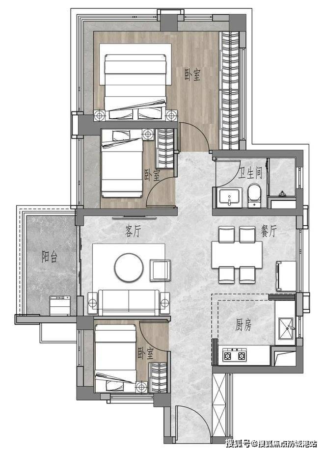 新规户型:69㎡三房一卫通过飘窗、阳台创新设计,空间感堪比80㎡以上户型。