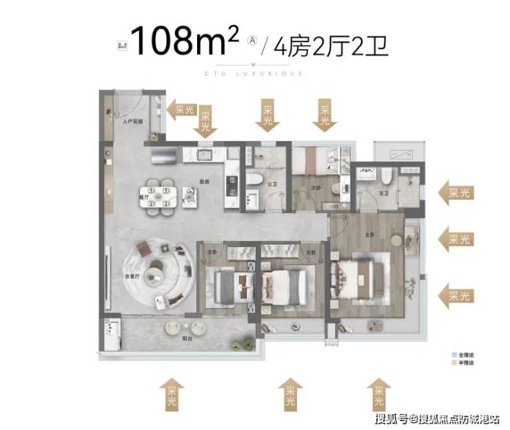 A:目前主推89㎡三房两厅两卫、108㎡四房两厅两卫,均为南北通透、全明设计。