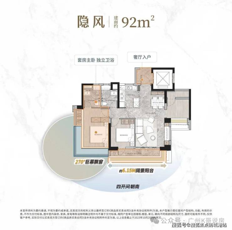建面约92㎡户型采用奢厅入户设计,营造尊崇的归家仪式感;极致的空间布局实现了超高可用率与四开间朝南,让室内采光充足、通风流畅;约6.15M的阔景阳台能够让业主尽揽阳光清风,享受惬意的居家时光;主卧配备270°巨幕飘窗,无垠景观环绕,提升了居住的舒适度与私密性。在建材配置上,该户型采用了知名品牌的门窗、地板以及卫浴设施,具有良好的耐用性与品质保障,为业主的日常生活提供了坚实的支撑。