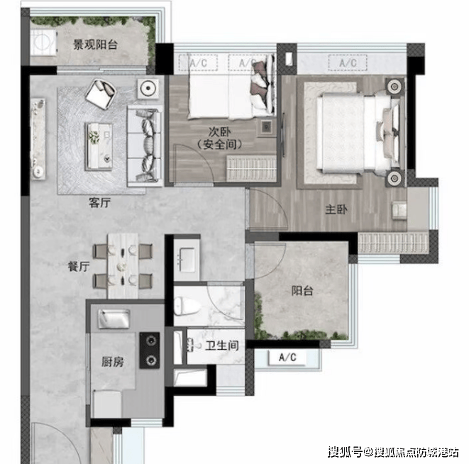 115㎡三房:5.5米景观阳台连通次卧,主卧面宽4.1米,居住体验媲美传统大户型。