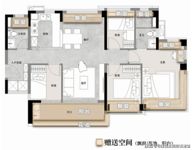 82㎡三房两厅两卫:该户型设计有多个飘窗,增加了室内的采光和通风,动线设计合理,入户花园转角玄关提供了更好的私密性,非常适合注重生活品质的业主。