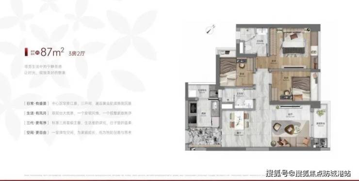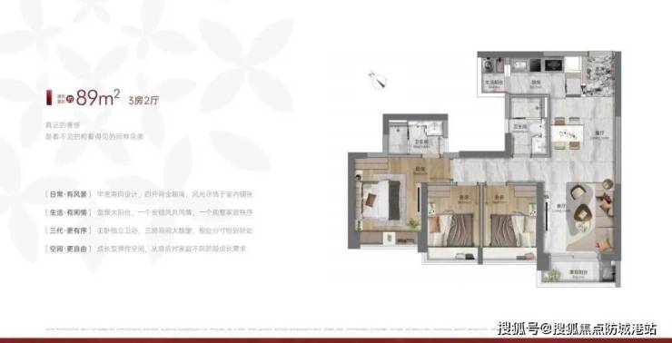 建面87-89平三房两卫,带主套设计,89平四开间朝南,三个房间带有大飘窗,总价330-380万左右。