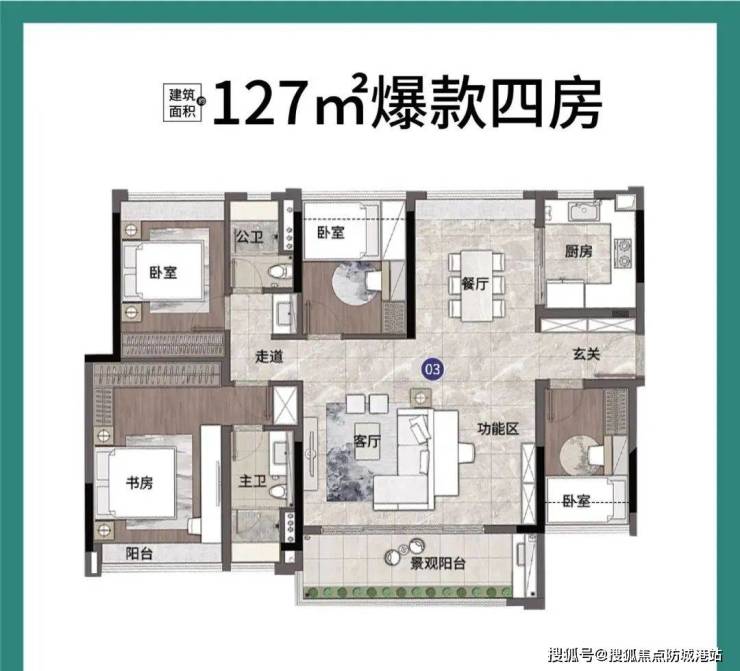 建面127平四房两卫,客餐厅一体化设计,南北对流,大阳台,私密主卧套房设计,