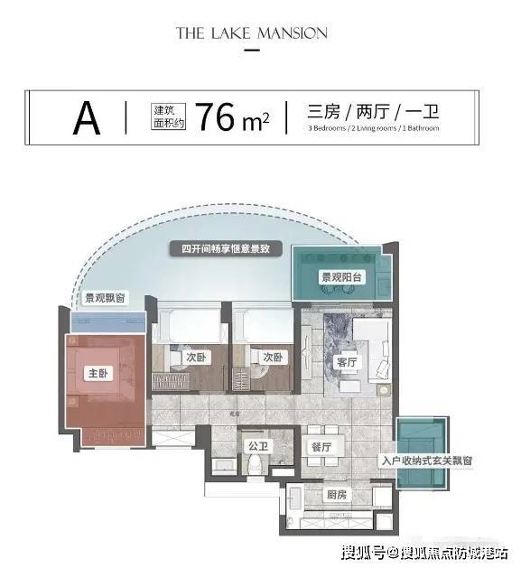 建面87平三房两卫,主卧套房设计,带有独立卫浴,入户玄关,增加收纳空间,四开间朝景