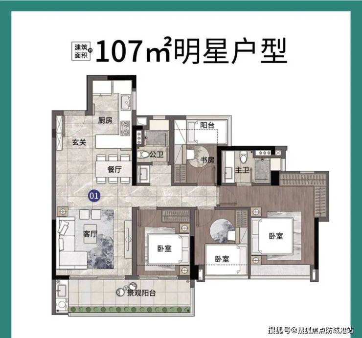 建面107平四房两卫,超高实用率,约6.8长景观阳台,主卧套房设计