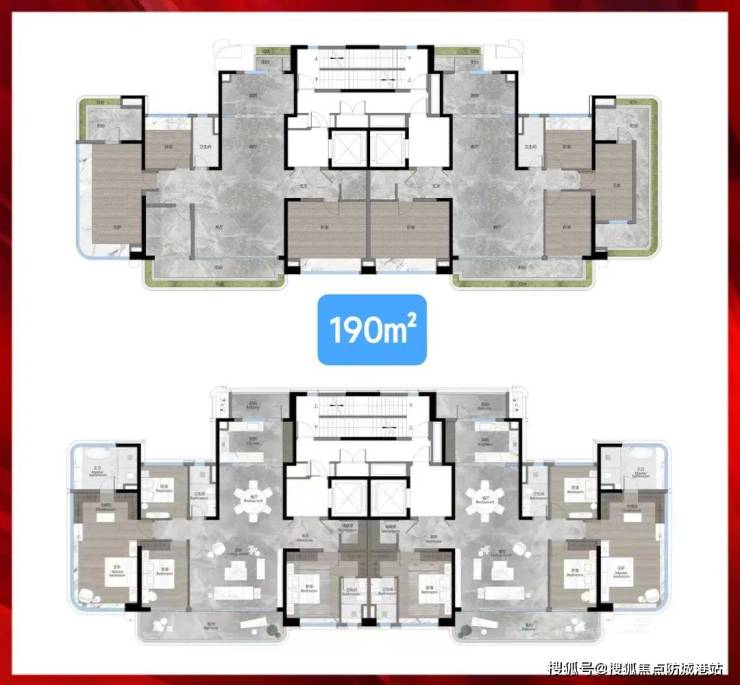 约190㎡四房,南向景观阳台横跨客餐厅,尺度很大;主卧套房,衣帽间够大,卫生间也能放得下浴缸;另一个套房,能做小一点的衣帽间。
