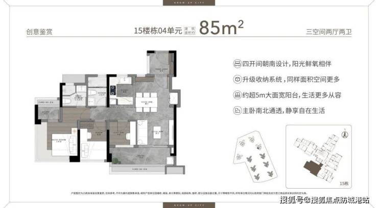 85㎡舒适三房:市场主力。四开间朝南,约5.1米超长阳台,俯瞰二期园林中轴,通透舒展。