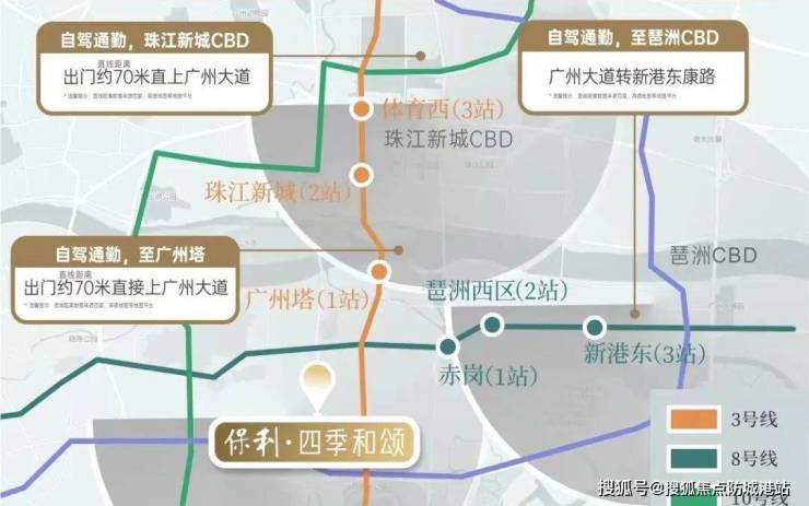 项目构建“地铁+高架+主干道+公交”立体交通体系:周边3/8/10/11号线4条地铁交汇,距在建11号线逸景路站约1.5公里,1站达广州塔、2站至珠江新城、3站抵体育西;广州大道南直通珠江新城,新滘中路快速接驳琶洲,自驾15分钟覆盖三大CBD。社区门前设公交总站,20余条线路串联全城。虽地铁步行距离稍远,但通过社区接驳车与共享单车系统,可实现“最后一公里”无缝衔接,高效通勤体验不输核心区。