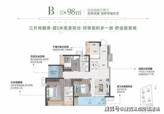 98平方米户型:超5米宽阳台,户户朝南,通风采光佳,主卧套房宽敞明亮,使用率超9成。