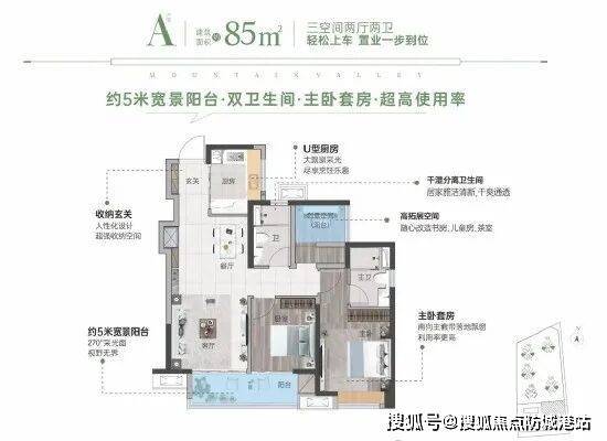 85平方米户型:南向三房带主套设计,配备约5米宽大阳台,U型厨房设计,使用率高达90%。