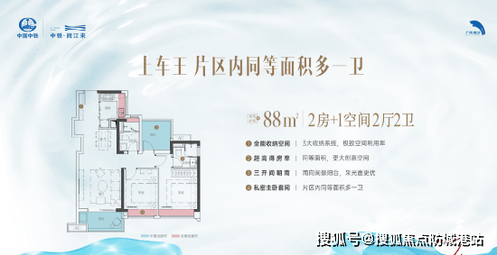 上车王88㎡户型:此户型在同面积段中拥有更多的拓展空间,额外增加了一个卫生间,并且具备南向无遮挡江景视野,超大玄关收纳空间也是一大亮点。