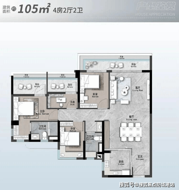 142㎡四房两厅三卫: 改善臻品,四开间朝南,6.8米超长阳台,双套房设计,总价约824万起,备受高净值人群青睐。