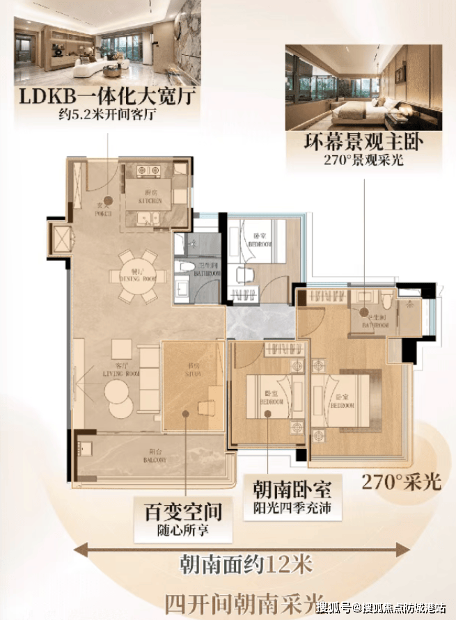 设计亮点: 中轴线上稀缺的“新规”小户型全能产品。采用LDKB一体化方厅设计,约5.2米开间连接南向宽景阳台,形成开阔的公共活动区。