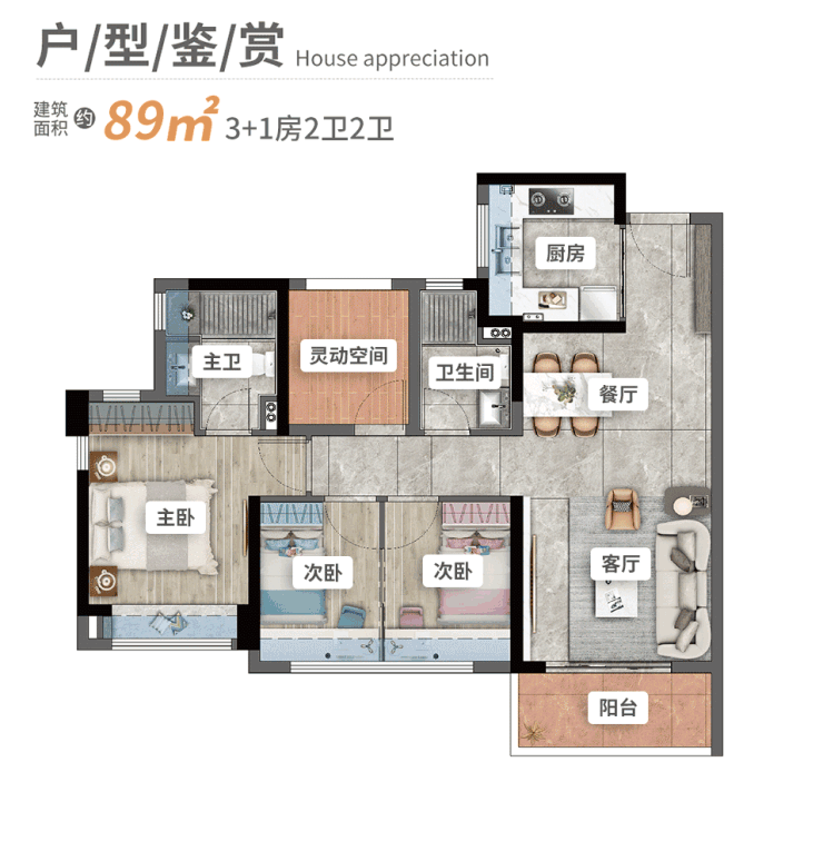 千语庭产品力突出,其户型设计不仅获得国家专利认证,更以超高实用率和极致空间利用获得市场一致认可。项目主推建面约83㎡三房1.5卫、89㎡四房两卫及98㎡四房两卫产品,最高得房率可达96%。所有户型均配置U型厨房、独立套房主卧,最小单位也具备主卧独立卫浴功能。南向采光是千语庭产品最大亮点之一,最少可实现3.5开间朝南,最大达到五开间全南向,保证日照与通风。次卧设计灵活,可实现间隔或打通,适应一孩或二孩家庭不同阶段的成长需求。大尺度厨房和宽幕阳台有效拓展家庭活动空间,动静分区明确,动线设计流畅,体现出设计者对家庭居住细节的深度洞察,真正做到了面积虽紧凑,功能却全维度覆盖。| 8