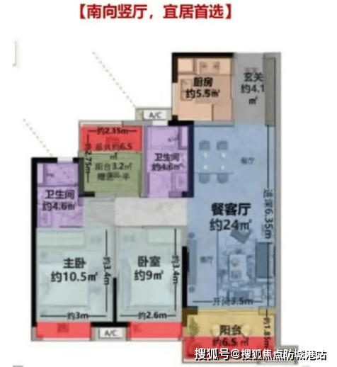 92㎡:三房两卫,南北对流,270°阳台,居住舒适度高。