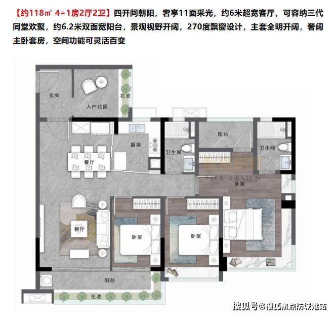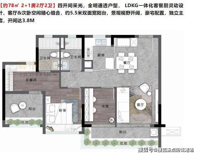 小区采用围合式布局,是智慧城唯一容积率低至 2.5 的项目,打造 12 + 1 层高花园小高层,楼距超 90 米,户户皆景。在售建面约 78 - 118㎡三房至五房,LDKG 客餐厅一体化设计,双面宽阳台、多面宽采光,保证最佳景观视野,实用率超高,部分达 100% 以上(含赠送),为天河区唯一户型高赠送社区。同时,规划通风廊道,引入山景、湖景,保证空气对流。全玻璃外立面,采用公建式设计,彰显高端大气。