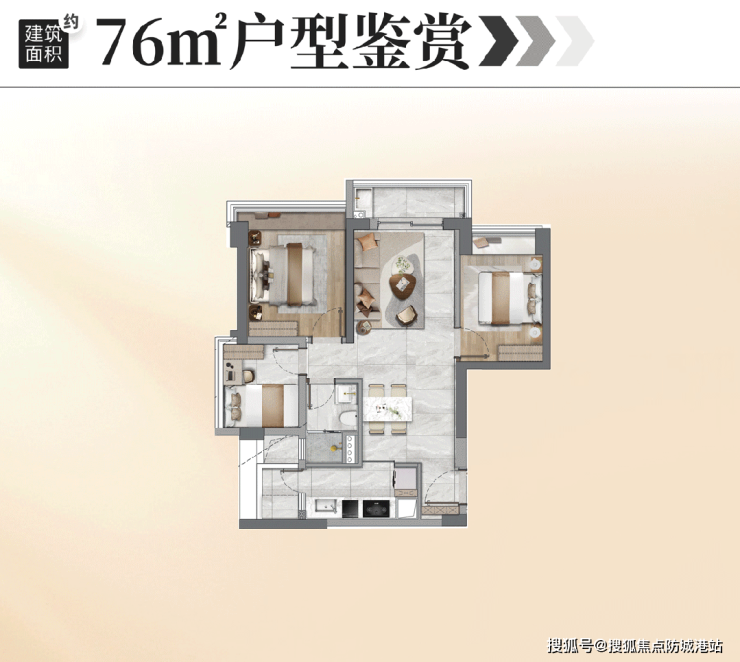 建面约76㎡户型,在同面积段产品中极具竞争力,打破常规设计,实现了真正实用、舒适的三房布局,而非逼仄的“1+2”房。每个家庭成员都能拥有独立、舒适的居住空间,次卧足以放下双人床和衣柜,满足日常居住需求。更值得一提的是,该户型景观全面升级,实现江园双景叠加,推窗即可欣赏自然与江景美景,让小户型也能拥有高品质居住体验。