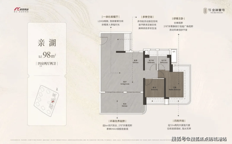 以98㎡3+1房两卫为例,总价304万起,东南朝向,动静分区清晰,飘窗可改造为书桌或储物区,适合年轻家庭一步到位;115–123㎡四房采用LDKB(客厅、餐厅、厨房、阳台)一体化设计,南向采光面达12–15米,通透感极强;131–132㎡四房配置2梯4户,部分单位可远眺金山湖景;而148㎡大四房则打造约6.6米超大横厅,南北双阳台贯通,主卧套房带独立衣帽间,满足多代同堂或高阶改善需求。