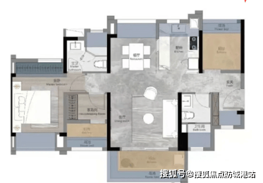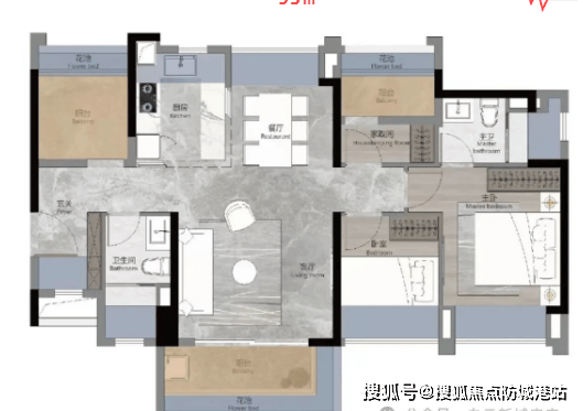 95㎡四房户型:该户型空间宽敞,布局方正,四房设计能够满足改善型家庭的需求。客餐厅一体化设计,连接大尺度景观阳台,采光通风效果好。卧室空间充足,均能容纳大床和衣柜,收纳空间丰富。建材方面,除了常规的一线品牌建材外,该户型还在细节处进行了升级,如厨房配备了嵌入式家电接口,方便业主后期安装家电;卫浴间采用防水石膏板吊顶,防潮效果更佳,耐用性更强。