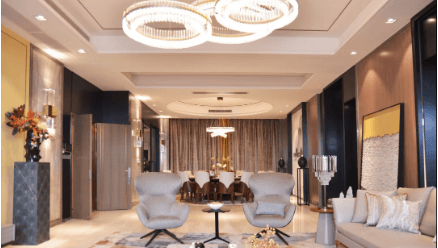 约 4 米层高,远超过市面多数豪宅的层高,营造出开阔大气的空间感;约 6.5 米开间,会客宴请宾朋挥洒自如。多套房设计,充分保护不同家庭成员间的私密。国学专家刘思成表示,房间面积大,加上大面宽飘窗,易形成明亮通透的布局设计。华标峰湖御境的主卧面积阔绰,空气流通,让主人公拥有良好的睡眠质量。