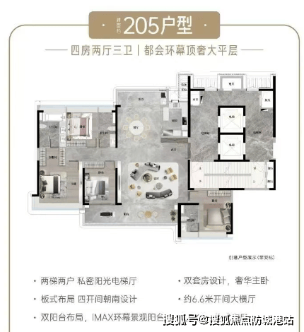 205㎡奢适四房:双阳台设计,近9米宽巨幕阳台,适合追求极致居住体验的家庭。
