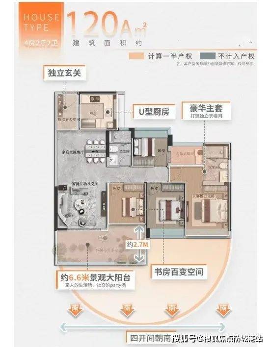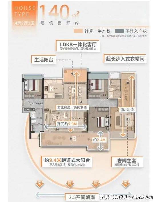 建面约140㎡四房全景大宅:南北对流、通透宽敞,拥有约9.4米跑道式大阳台。