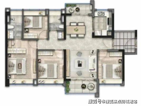 140㎡四室两厅三卫:采用方正宽奢布局,配备巨幕观景阳台。双套间大面宽设计,拉阔生活尺度。四开间朝南,拥有大面宽采光尺度,尽享阳光与江景。售楼处电话:4009909752。