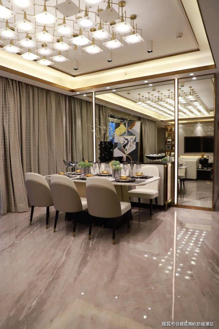材料特点:大理石瓷砖的连纹设计增强了空间的整体性,使餐厅显得更加华丽自然。