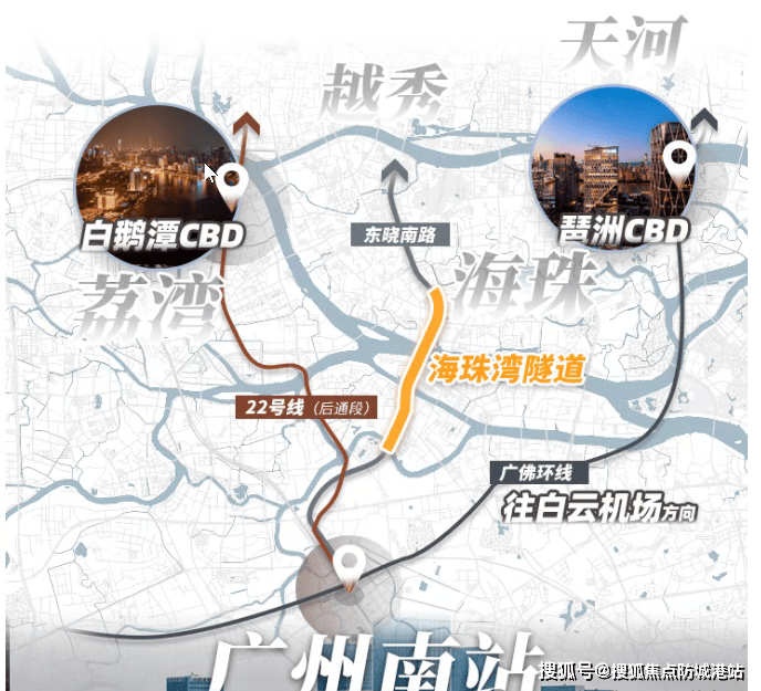 22号线(后通段)预计2025年开通,实测从项目到22号线广州南站站点约1.8公里,驾车5分钟可达,开通后5站直达白鹅潭CBD;广佛环线东环2025年开通,3站可达琶洲,时速160公里,通勤效率大幅提升。