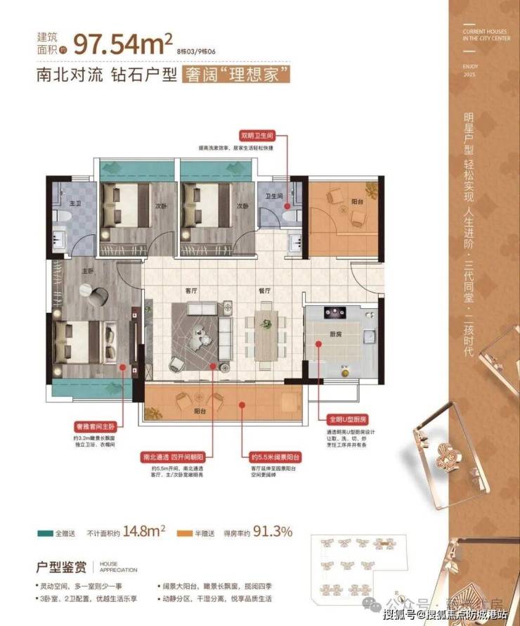 三代同堂再也不是梦让辛苦多年的长辈多一分享受南北对流 同等价位买大四房8座06户型:4房2厅2卫 建面约97㎡