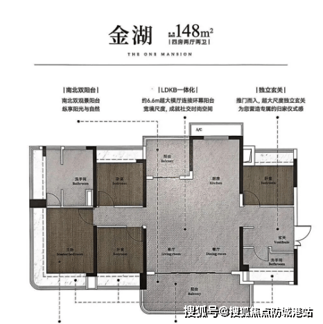 148㎡四房两卫:顶级户型,提供极致的居住体验。超大面积的阳台设计,让业主尽享湖景风光。